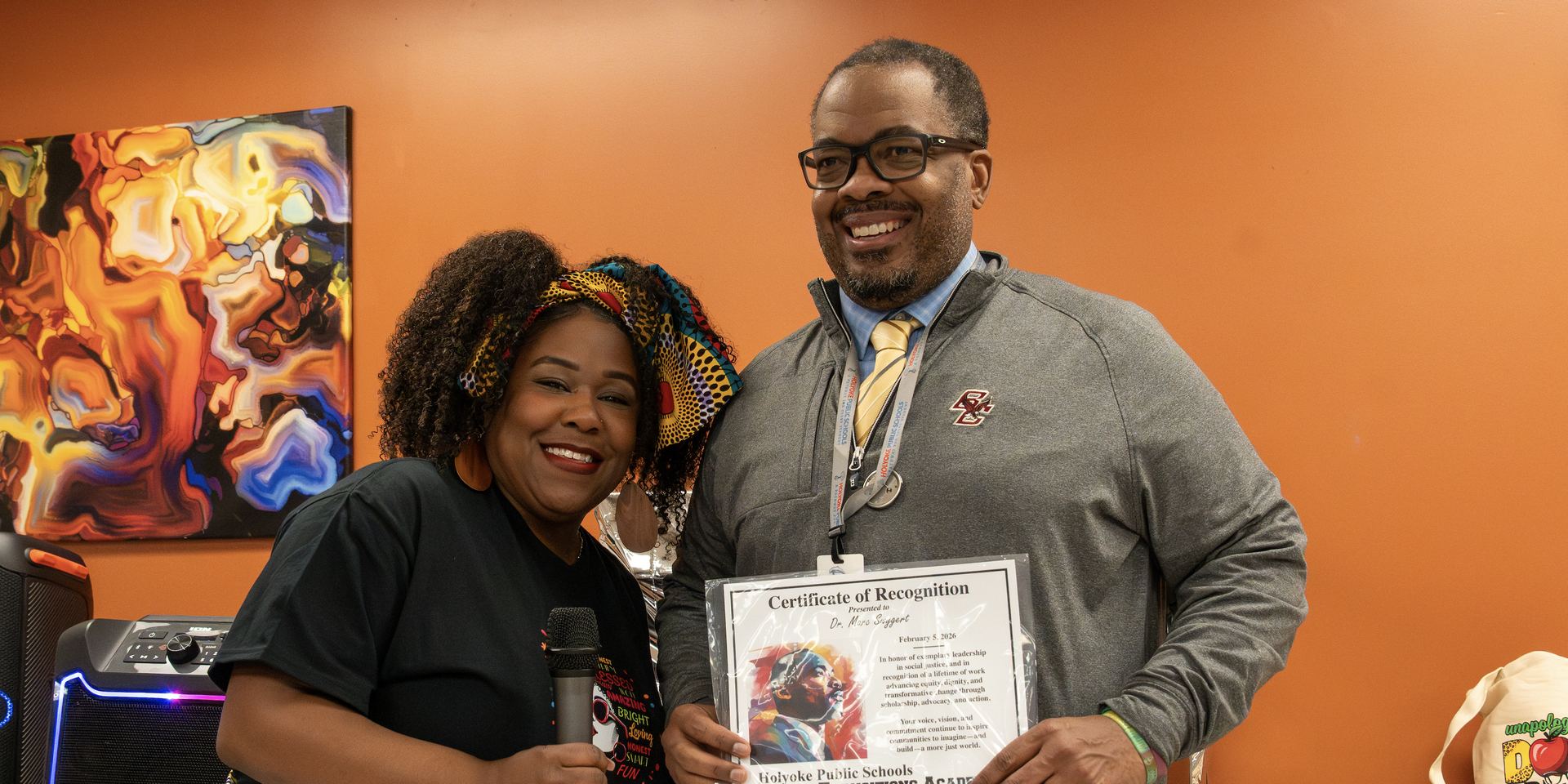 Following the student performances was a special presentation: The inaugural Transitions Academy Black History Month Leadership Award was presented to Donahue Principal Dr. Marc Swygert, honoring his years of school and community leadership. |